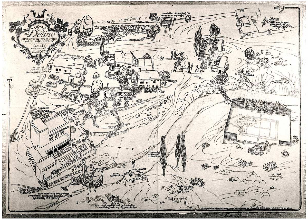 A map of El Delirio, the White sisters’ estate in Santa Fe, 1927,by Gustave Baumann.
