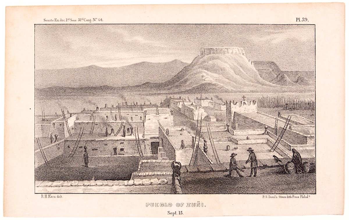 Pueblo of Zuñi, 1850, by P. S. Duval, lithographer, of Philadelphia. From an original 1849 drawing by Richard H. Kern (1821-1853), of Philadelphia.